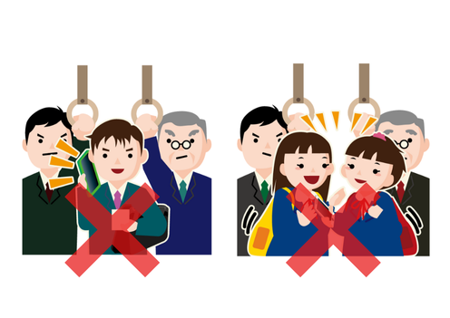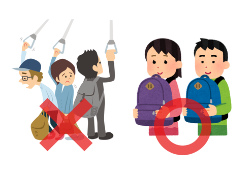 自分の荷物が周りの迷惑にならないようにする!混んでいる時は、荷物を前にかかえましょう。